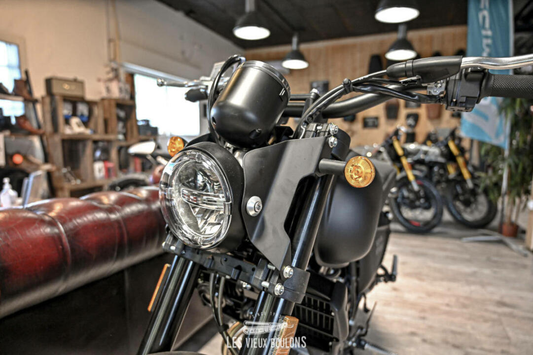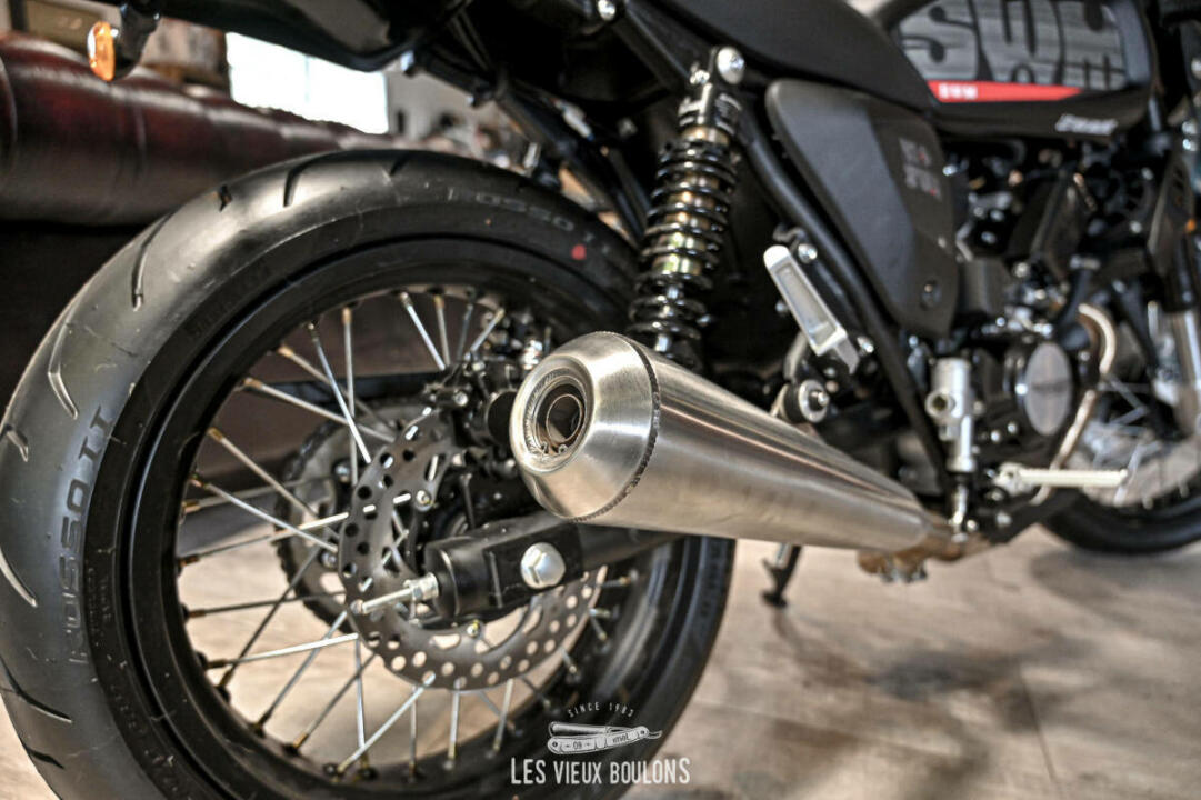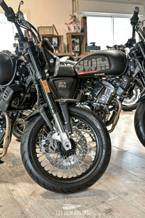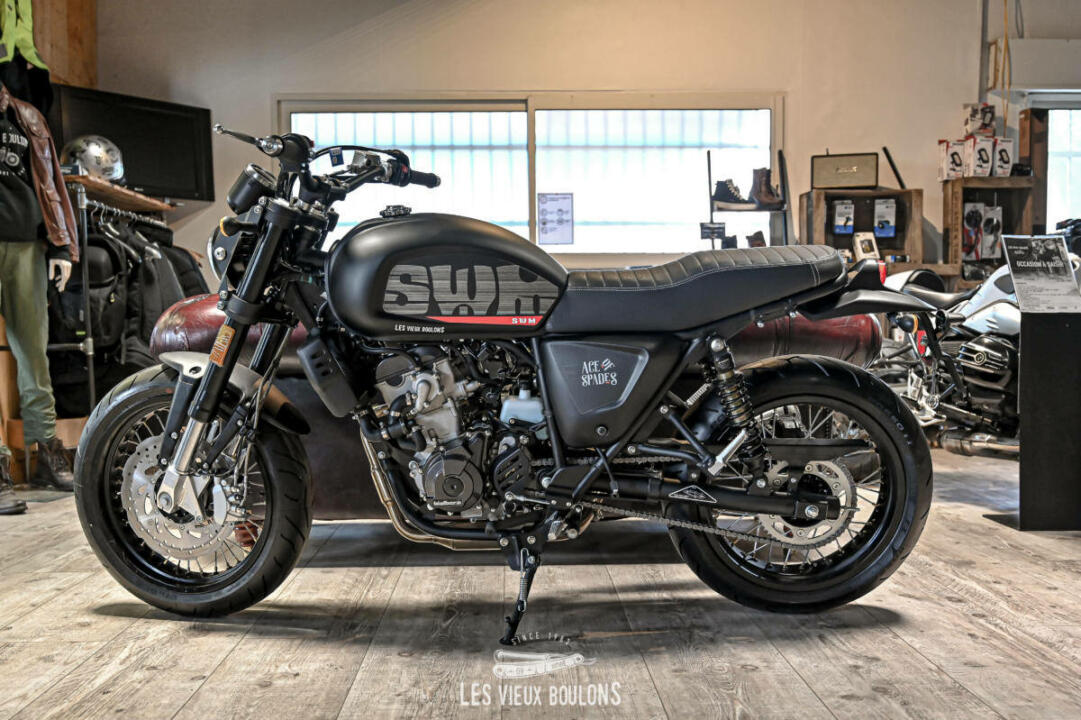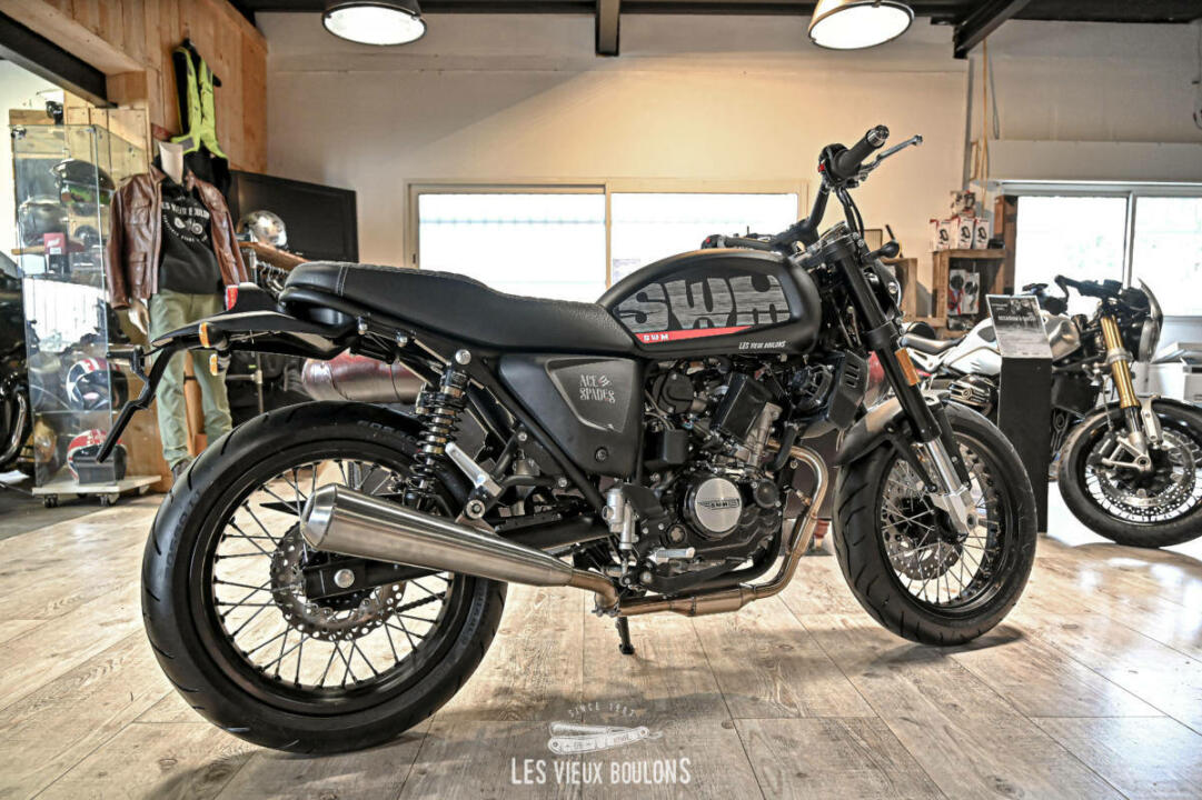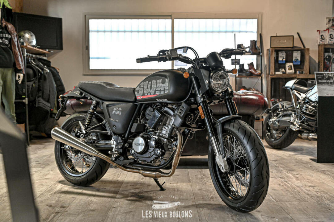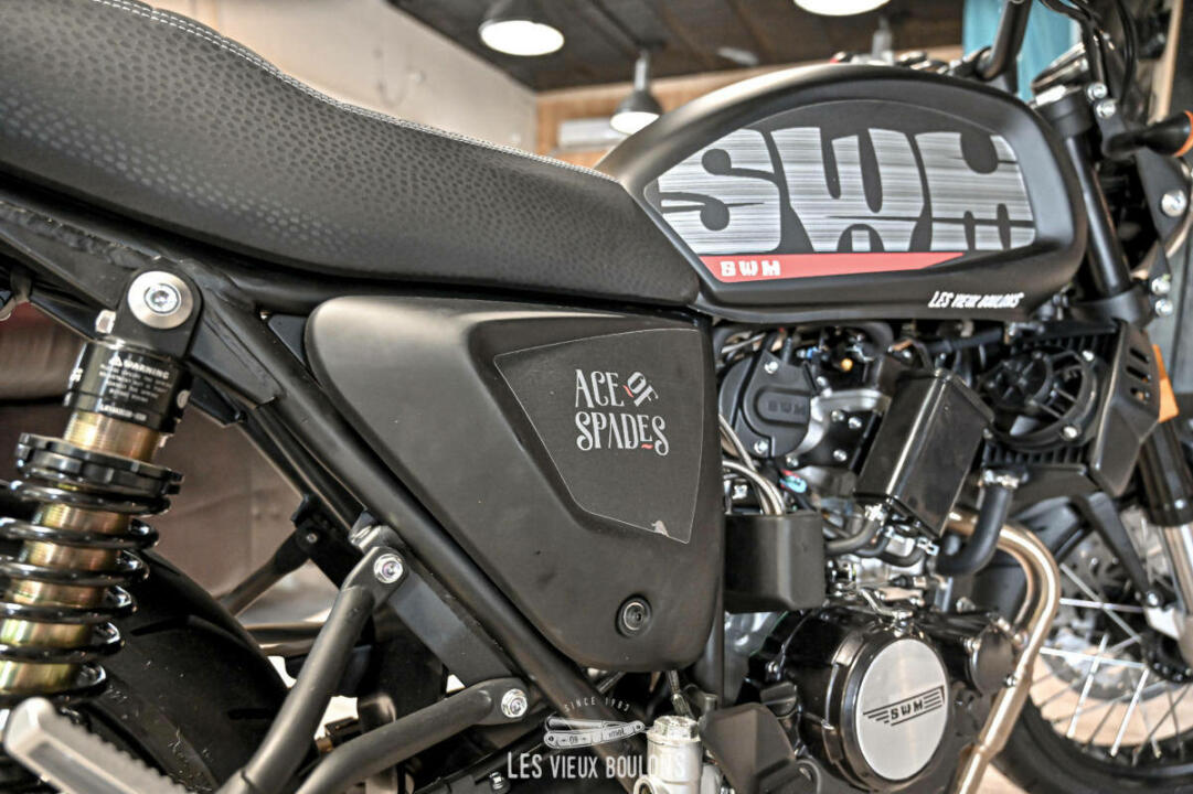 La SWM Ace of Spades 125 est de retour, en Euro 5 ! SWM en a profité pour relooker sa moto avec de nouveaux stickers ! Son moteur monocylindre de 125 cm3 développe 15 chevaux à 10500 tr/min et entraine les 140 kg de la moto à une vitesse maximale de plus de 120 km/h. Sa partie cycle bien équilibrée avec des freins à disque avant et arrière et des amortisseurs réglables la rendent très sécurisant. Envie de sortir des sentiers battus ? Pas de problème. Sa garde au sol de 169 mm lui permet d’aller sur les chemins de gravier. Cerise sur le gâteau, la SWM Ace Of Spades possède un système d’échappement haut-de-gamme délivrant une sonorité rauque très agréable.